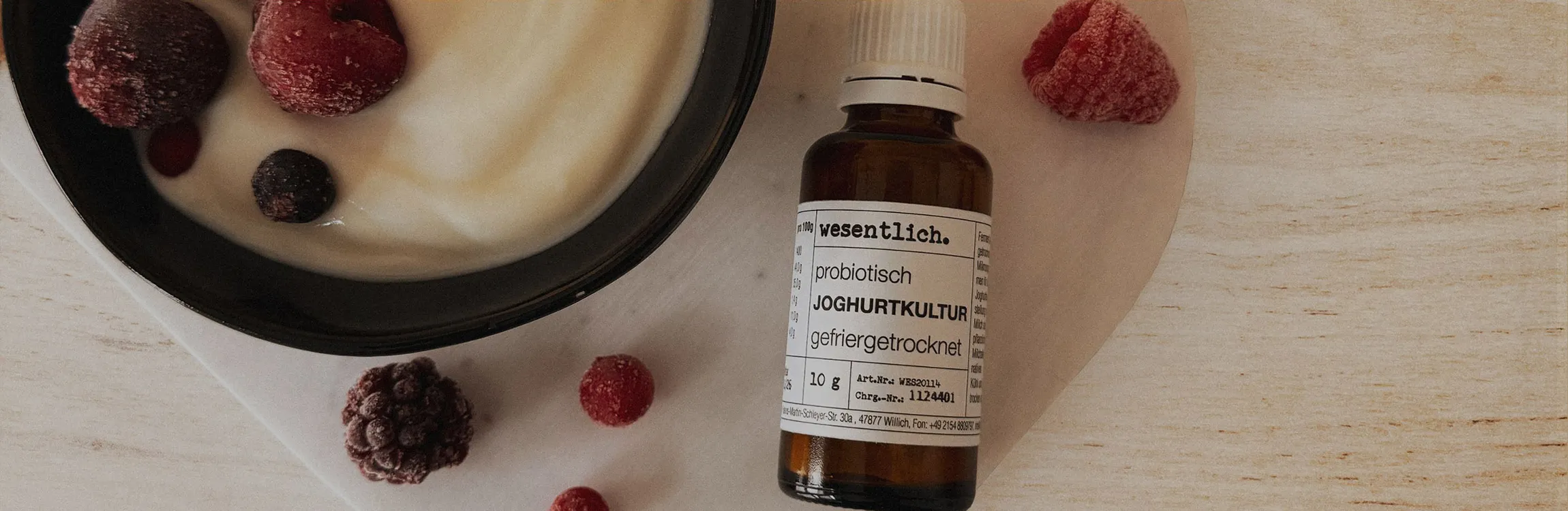 Mit diesen Joghurtkulturen wird Deine Küche zur kleinen Fermentationswerkstatt. In jeder Braunglasflasche steckt ein feines Pulver aus gefriergetrockneten Mikroorganismen, die nur darauf warten, mit Milch in Kontakt zu kommen – und sich in köstlich cremigen Joghurt zu verwandeln. Ganz ohne Zusatzstoffe, ganz natürlich, ganz Du.Ob Du H-Milch bevorzugst, frische Vollmilch nutzt oder lieber auf pflanzliche Alternativen wie Soja-, Hafer- oder Mandelmilch zurückgreifst – dieses Ferment passt sich Deinen Vorlieben an. Eine kleine Messerspitze auf einen Liter genügt bereits, um die natürlichen Prozesse in Gang zu setzen. Die Bakterienkulturen beginnen zu arbeiten, fermentieren die Milch und sorgen so für ein rundes, mild-säuerliches Aroma und eine wunderbar weiche Textur.Die enthaltenen Mikroorganismen – sorgfältig ausgewählte Milchsäurebakterien – sind echte Profis in Sachen Joghurt. Sie stammen aus bewährten Kulturen, die schon seit Jahrzehnten in der Joghurtherstellung eingesetzt werden. Durch ein besonders schonendes Gefriertrocknungsverfahren werden sie in einen ruhenden Zustand versetzt und bleiben so lange haltbar, bis Du sie brauchst. Sobald sie mit Milch in Kontakt kommen, erwachen sie zum Leben und zeigen, was sie können.Abgefüllt wird das Ferment in Deutschland – unter strengen Qualitätsstandards und mit einem feinen Gespür für Präzision. Die lichtgeschützte Braunglasflasche sorgt dafür, dass die empfindlichen Kulturen optimal geschützt sind. So bleibt alles frisch, rein und wirksam – genau so, wie es sein soll.Du bestimmst, wie mild oder kräftig Dein Joghurt wird, wie lange Du ihn reifen lässt und womit Du ihn verfeinerst. Ob pur, mit Früchten, Nüssen oder einem Hauch Vanille – die Basis kommt aus Deiner Hand. Und das macht nicht nur Spaß, sondern auch stolz. Denn mit einem so natürlichen Produkt selbst Joghurt herzustellen, fühlt sich richtig gut an.Das Joghurtferment ist eine tolle Wahl für alle, die gerne bewusst genießen und dabei wissen wollen, was im Glas steckt. Die Anwendung ist einfach, die Wirkung überzeugend – ein kleines Bisschen Wissenschaft, verpackt in einer wohlschmeckenden Tradition. Ideal auch für Einsteiger:innen, die sich an das Thema Fermentation herantasten möchten, ohne gleich zum Profi-Equipment zu greifen.Mit jeder Portion tust Du nicht nur Dir selbst etwas Gutes, sondern auch Deiner Küche. Denn was gibt es Schöneres, als den Moment, wenn sich aus simplen Zutaten ein ganz neues, frisches Lebensmittel entwickelt – voller Geschmack, Natürlichkeit und Charakter?Dein selbst gemachter Joghurt wartet schon. Alles, was Du brauchst, ist ein Liter Milch, ein wenig Zeit und diese feine Portion Kultur.
